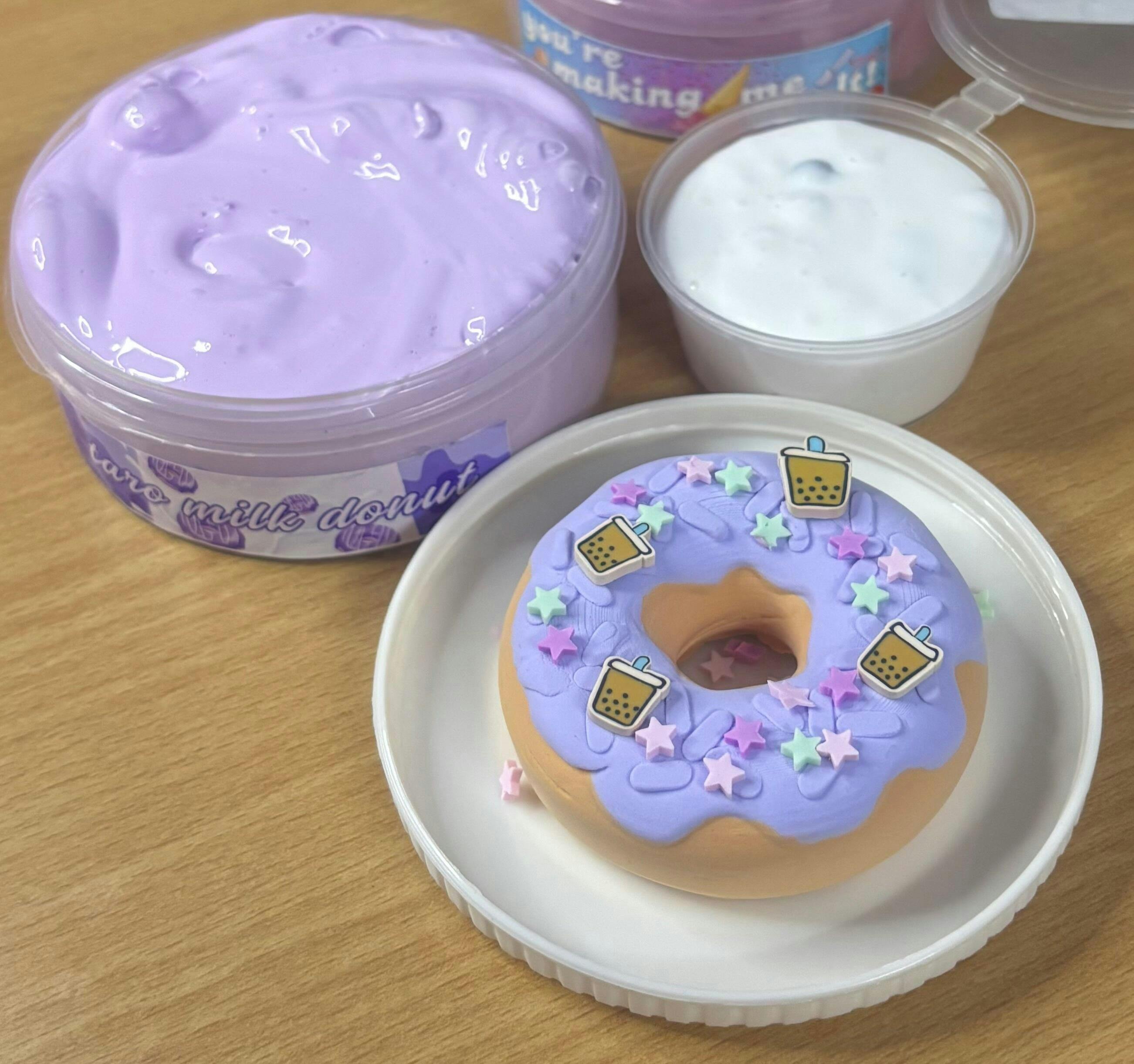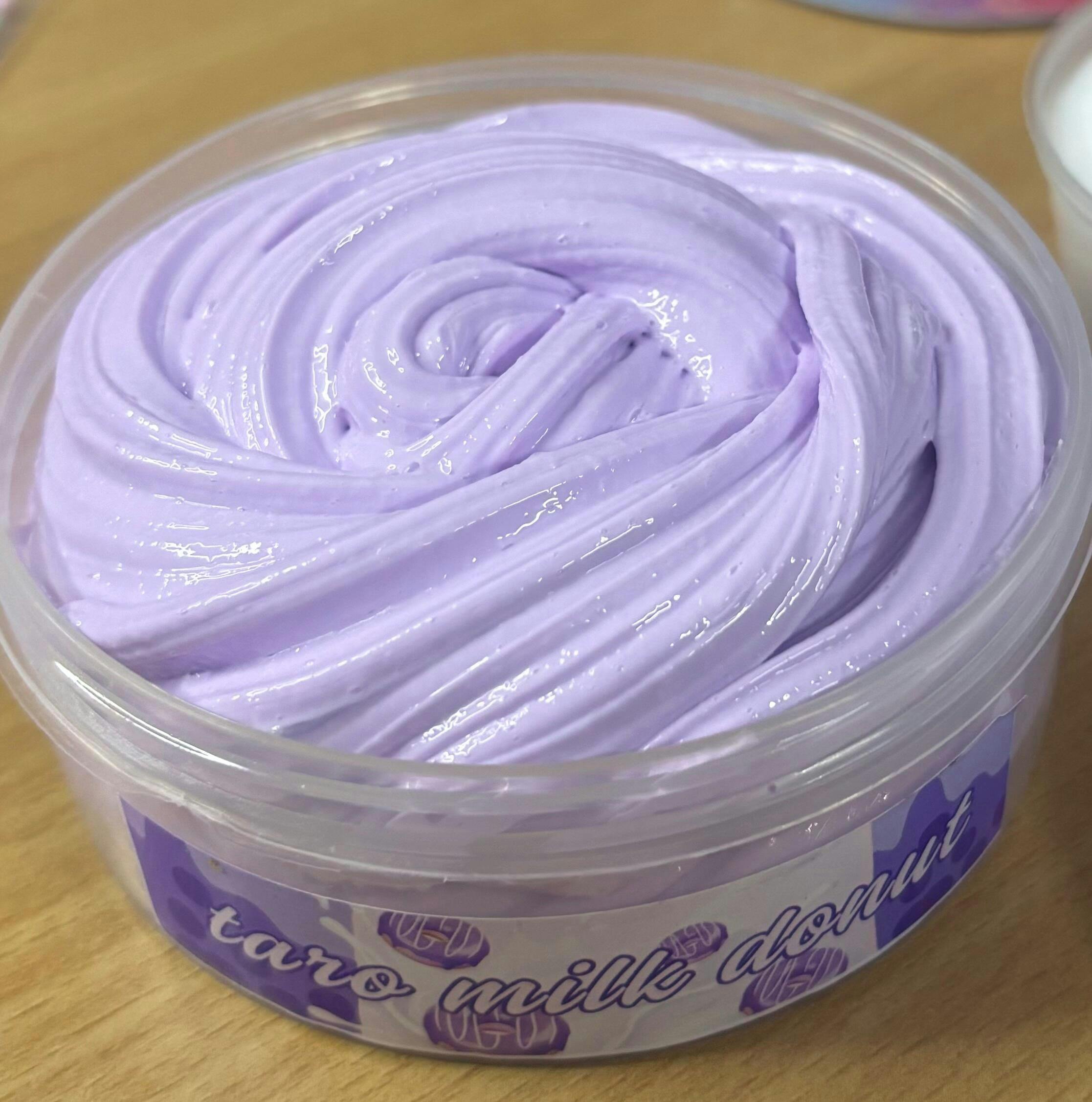 Indulge in a delightful treat with our TARO MILK DONUT! This gorgeous slime comes with a lavender/dusky blue gloss colour shifting slime comes with a cream boba sauce and a taro donut that smells just like the warm raspberry ube flavour!